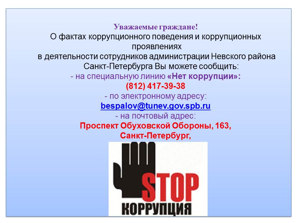 417-39-38 - телефон «горячей линии» Невского района «Противодействие коррупции»